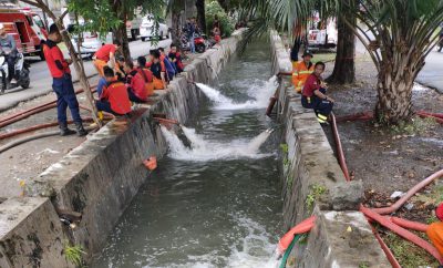 Dinas Sumber Daya Air dan Bina Marga (DSDABM) Kota Surabaya, juga bergerak turun menanggulangi genangan. Petugas melakukan normalisasi dan pembersihan saluran primer.