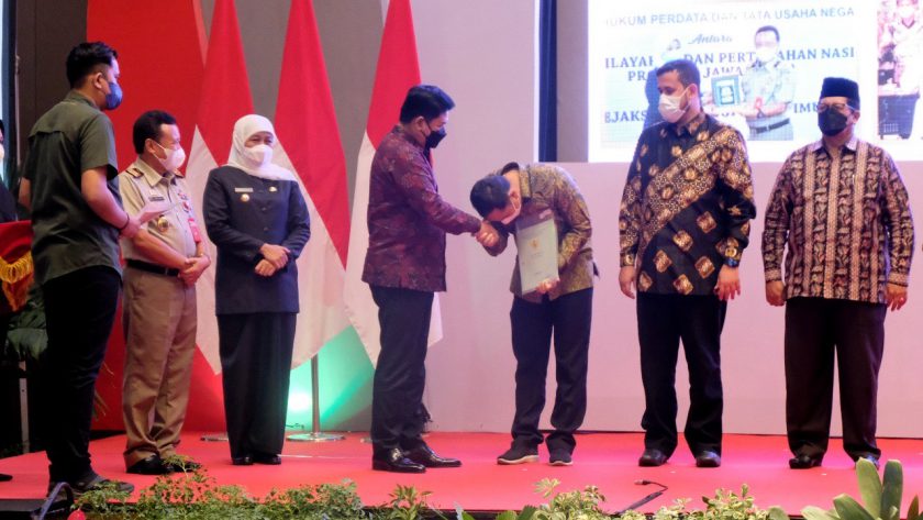 Surabaya,(DOC) – Wali Kota Surabaya Eri Cahyadi menghadiri kegiatan Rapat Koordinasi Penguatan Sinergitas Pemerintah Provinsi dan Daerah. Di ikuti seluruh Stakeholder melalui Forum Gugus Tugas Reforma Agraria (GTRA) dan Pola Trijuang Menuju Jawa Timur Lengkap, untuk Mewujudkan Kesejahteraan Rakyat, di Hotel Vasa Kota Surabaya, Jumat (1/7/2022). Dalam kesempatan tersebut, Wali Kota Surabaya Eri Cahyadi juga melakukan penyerahan hibah tanah seluas 5.000 m2 yang berada di Kelurahan Medokan Ayu, kepada Kepala Kantor Badan Pertanahan Nasional (BPN) II Kota Surabaya Lampri, yang di saksikan langsung oleh Menteri Agraria dan Tata Ruang/Kepala Badan Pertanahan Nasional (ATR/BPN) Hadi Tjahjanto.Aset milik Pemerintah Kota (Pemkot) Surabaya senilai Rp 22 Miliar itu, rencananya akan di gunakan sebagai kantor untuk mendukung kinerja pelayanan sertifikat tanah BPN II di Kota Pahlawan.