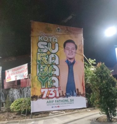 Pria yang akrab di sapa Mas Toni itu, memasang baliho yang memuat pesan ‘Selamat Hari Jadi Kota Surabaya (HJKS) ke-731’. Baliho ukuran besar itu, terpasang di Jalan Wonokromo, Kombes Pol Duriat dan beberapa titik lainya.