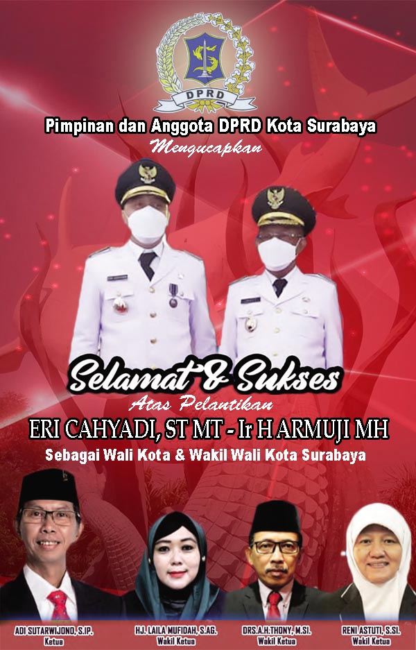 DPRD Surabaya Mengucapkan Selamat & Sukses atas Pelantikan Eri Cahyadi – Armuji admindewan27/02/2021216 Dilihat Post Views: 216 Baca Juga: DPRD Surabaya Mengucapkan Selamat Idul Fitri 1442 H Pos terkaitPimpinan & Segenap Anggota DPRD Kota Surabaya Mengucapkan Selamat Hari Natal 2025DPRD Surabaya Mengucapkan Selamat Hari Jadi Kota Surabaya ke – 732 TahunDPRD Kota Surabaya Mengucapkan Selamat Idul Fitri 146 HDPRD Surabaya Mengucapkan Dirgahayu Kemerdekaan RIDPRD Surabaya Mengucapkan Selamat Hari Jadi Kota SurabayaDPRD Kota Surabaya Mengucapkan Selamat Hari Raya Idul Fitri 1445 H