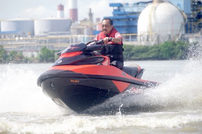 Usai meninjau SIR, ia langsung mencoba bermain Jet Ski. Pria yang akrab disapa Cak Ji ini mengungkapkan, bahwa dirinya sempat mengendarai Jet Ski dengan kecepatan tinggi di sekitar perairan Romokalisari dan teluk Lamong.