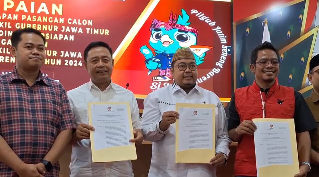 Surabaya, (DOC) – Komisi Pemilihan Umum (KPU) Provinsi Jawa Timur, Minggu (22/09/2024) menetapkan pasangan calon yang maju dalam kontestasi Pilkada Jawa Timur. Ketiga paslon ini telah melewati sejumlah tahapan di KPU Jatim, mulai pendaftaran, verifikasi administrasi dan faktual, serta pemeriksaan kesehatan.