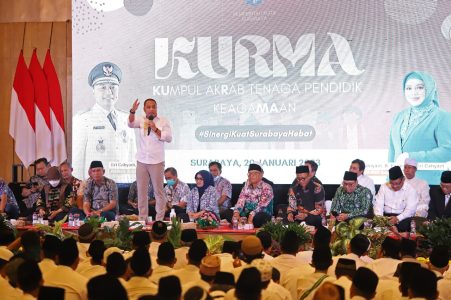 Pada kesempatan ini, Wali Kota Eri Cahyadi didampingi oleh PJ Sekda Kota, Asisten, Kepala PD, dan Ketua Tim Penggerak (TP) PKK Surabaya. Di pertemuan ini, dihadiri pula oleh 2.575 tenaga pendidik keagamaan dari 7 kecamatan yang ada di wilayah Surabaya Timur.