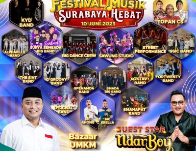 Surabaya,(DOC) – Pemerintah Kota (Pemkot) Surabaya bersinergi bersama PDAM Surya Sembada menyelenggarakan festival musik. Acara bertajuk ‘Festival Musik Surabaya Hebat’ tersebut, di selenggarakan di depan halaman pintu selatan Balai Kota Surabaya, Sabtu(10/6/2023) sore besok.