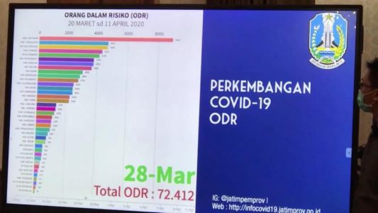Berdasarkan data Pemprov Jatim, total Pasien Dalam Pengawasan (PDP) tercatat 1.447 pasien. Namun, yang masih dalam pengawasan 872 pasien. Sedangkan Orang Dalam Pemantauan (ODP) sebanyak 14.423 orang. Yang masih dalam pemantauan 7.813 orang.(div)