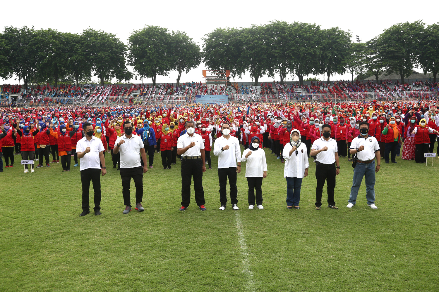 Bupati Lumajang H. Thoriqul Haq, M. ML., bersama Wakil Bupati, Ir. Hj. Indah Amperawati, M.Si, bersama Dandim 0821 Lumajang Letkol Czi Agus Iskarman, S.E., dan pimpinan OPD di lingkungan Pemkab Lumajang.