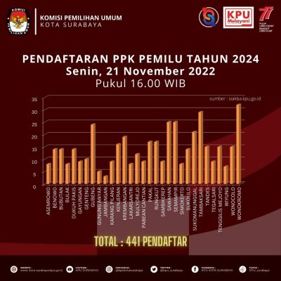 Data dari helpdesk KPU Kota, di Jalan Adityawarman 87 Surabaya, bahwa Minggu(20/11/2022) jumlah pendaftar PPK melalui SIAKBA sebanyak 176 orang. Kemudian pada Senin(21/11/2022), jumlah pendaftar bertambah menjadi 441 orang.