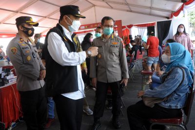 Surabaya, (DOC) – Polda Jawa Timur (Jatim) memberi vaksinasi dengan sasaran pekerja industri yang bekerja di Kota Pahlawan. Percepatan vaksinasi Covid-19 di Kota Surabaya semakin gencar dilakukan. Wali Kota Surabaya Eri Cahyadi meninjau pelaksanaan vaksinasi massal yang digelar di Kenpark, Kenjeran, Sabtu (26/6/2021).