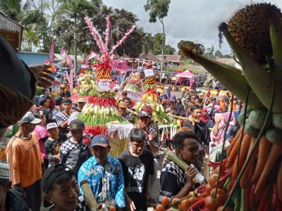 Tiba di Pemandian Alam Tirtosari gunungan hasil bumi akhirnya menjadi rebutan ratusan warga yang sudah lama menunggu.