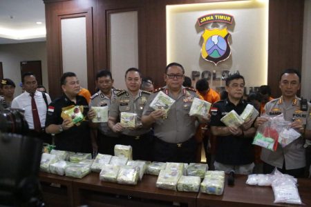 “Diawal tahun 2020, di minggu terakhir. Jajaran Polda Jatim dari Direktorat Narkoba ini mengungkap ada sindikat dari Malaysia ada kurang lebih 50 kilogram sabu,” ujar Kapolda Jatim saat menggelar konfersi pers di Gedung Patuh Mapolda Jatim di Jalan Raya Ahmad Yani Surabaya.