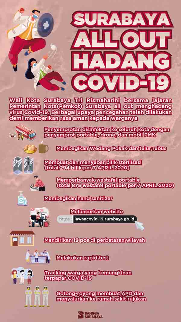 Pemkot Surabaya juga mendirikan 19 pos di setiap perbatasan wilayah Kota Surabaya. Di 19 titik itu, setiap kendaraan akan disemprot dan pengendaranya dianjurkan untuk masuk ke bilik sterilisasi dan cuci tangan serta cuci muka di wastafel yang sudah disediakan. Pemkot juga melakukan rapid test di seluruh puskesmas Surabaya. Tracking pun terus dilakukan terhadap orang-orang atau warga yang kemungkinan terpapar virus ini. Bahkan, saat ini Pemkot Surabaya rutin membuat alat pelindung diri (APD) untuk disalurkan ke berbagai rumah sakit rujukan yang ada di Kota Surabaya. (ADV)